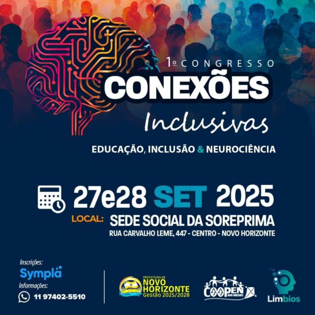Neste final de semana na sede social da Soreprima, numa organização da Coopen e Instituto Limbios de Neurociência e Educação, Novo Horizonte estará sendo sede do 1º. Congresso Conexões Inclusivas – Educação, Inclusão e Neurociência, que surge como uma iniciativa pioneira no Brasil, reunindo profissionais de destaque das áreas de educação, saúde e neurociência, com o objetivo de criar um espaço de diálogo e troca de conhecimentos que contribua para o avanço da inclusão de pessoas com deficiência em ambientes escolares e sociais.