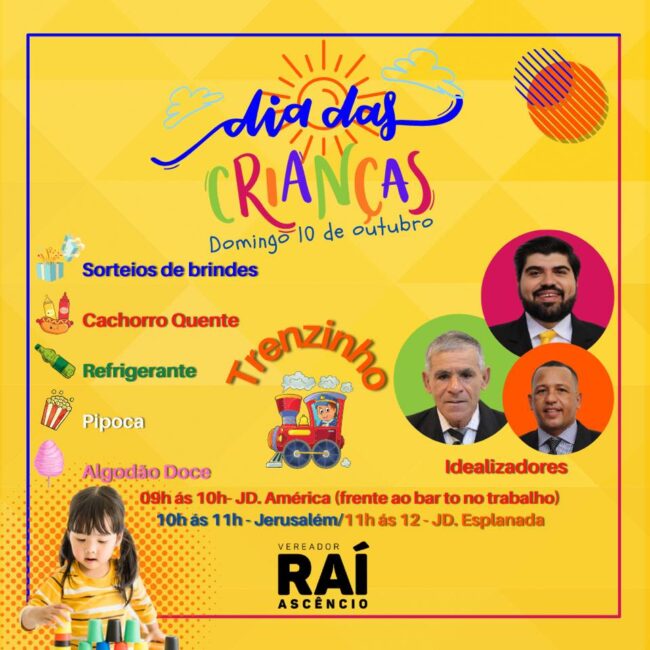 Pensando nas crianças do nosso município nos juntamos para trazer alegria em um momento tão difícil que estamos passando, seguindo todos os protocolos e medidas de segurança.Que a alegria e a pureza de nossas crianças sejam eternas, nosso futuro serão vocês crianças.Um feliz dia das crianças, que Deus vos abençoe grandemente e que nossa senhora da aparecida o cubra com seu manto.Vamos estar nos bairros: Jardim América das 9h as 10h local: enfrente ao bar tô no trabalho Jardim Jerusalém das 10h as 11h na praça Jardim São José/ esplanada das 11h as 12h na praça.Com muita alegria, pipoca,algodão doce, cachorro quente, refrigerante, distribuição de brindes e TRENZINHO GRATUITO!!!#raiascencio#Vereador#PelopovoParaopovo#novohorizontesp