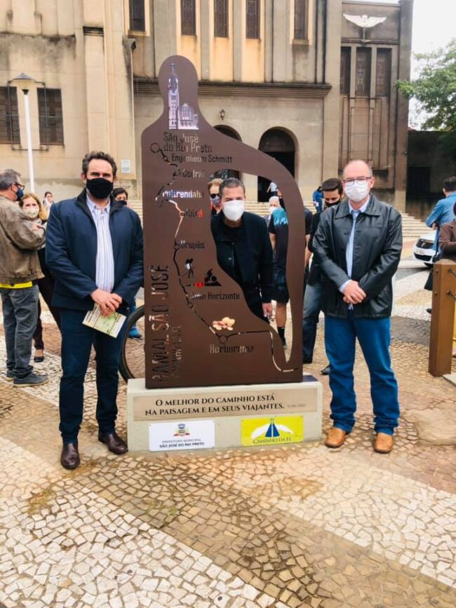Hoje estivemos na Abertura oficial do Ramal de São José em Rio Preto, o ramal de São José, integra agora o caminho da Fé. Incia-se em Rio Preto, passa por Schimit, Cedral, Potirendaba, Ibirá, Urupês e Novo Horizonte, que liga ao ramal de Borborema. Na oportunidade presenteamos autoridades e peregrinos com os botóns de São José! Nas fotos prefeitos, e autoridades, com destaque ao artista que criou a obra inaugurada em frente a Basílica Beto Carrazone. Obrigado a todos que estiveram presentes e, ao prefeito Fabiano que não mede esforços para participar do turismo de Novo Horizonte. E a Amarilis, por ser tão presente na gestão da Diretoria de Turismo. Prefeitura de Novo Horizonte –SP