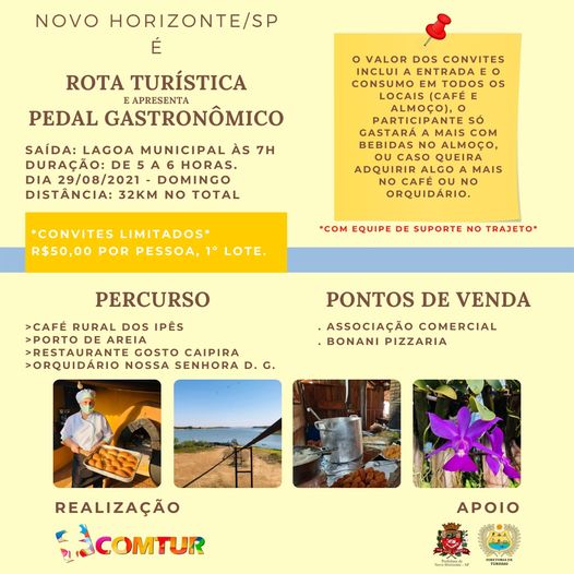 A Prefeitura de Novo Horizonte, através da Diretoria Municipal de Turismo, desenvolveu em parceria com COMTUR, o Curso de Agência de Turismo Receptivo, com aulas teóricas e práticas. No dia 28 de agosto os participantes colocarão em prática o conhecimento adquirido com a realização do Pedal Gastronômico, um roteiro de aproximadamente 32 km, visitando 4 atrativos turísticos de Novo Horizonte, com duração média de 5 horas. Todo o passeio, com café da manhã, almoço, entrada no Orquidário, monitores e estrutura de apoio durante o trajeto, terá o valor de R$ 50,00 por pessoa. O convite pode ser adquirido na Associação Comercial e Industrial de Novo Horizonte, das 8h às 17h e no Bonani Pizzaria, das 18h às 21h. Participe! Incentive o Turismo! Convites Limitados em virtude da pandemia! #pedalgastronomico#nh#diretoriadeturismo#DADETUR#turismorural#vempranh#SECTUR#desenvolvimentoeconomico#novohorizonte#turismo#cicloturismo