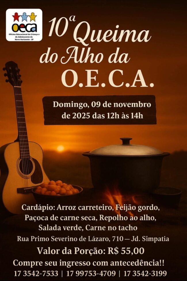 Domingo, acontece a décima edição da tradicional QUEIMA DO ALHO DA OECA que ocorre no horário das 12 as 14 horas. O cardápio será o seguinte: arroz carreteiro, feijão gordo, paçoca de carne seca, repolho ao alho, salada verde e carne no tacho.