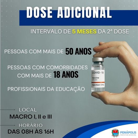 Para se vacinar, é necessário apresentar a carteirinha de vacinação e um documento com foto. Apesar da liberação da dose adicional para maiores de 18 anos com mais de 5 meses da segunda dose, Penápolis aplicará a vacina de forma escalonada, conforme o envio de doses do imunizante pelo Governo do Estado de São Paulo.