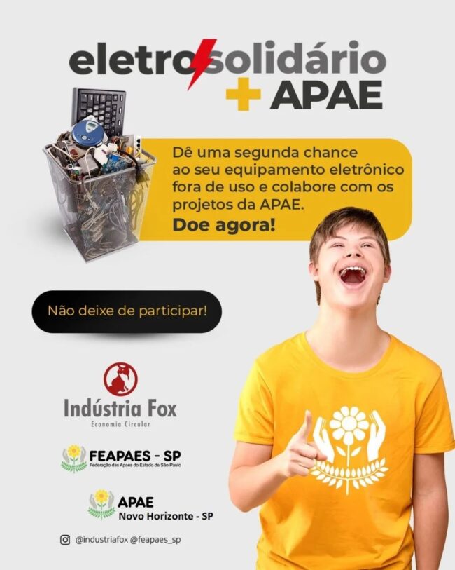 Sabe aqueles eletrônicos quebrados e sem uso que estão ocupando espaço na sua casa? Se você doá-los para a APAE de Novo Horizonte, eles podem virar dinheiro e ajudar na manutenção dos  atendimentos/mês que a instituição promove nas áreas de saúde, educação e assistência social.
