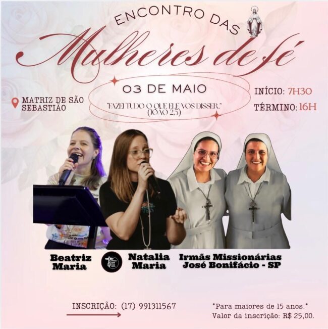 Neste domingo, dia 3 de maio, a Paroquia de São Sebastião de nossa cidade, promoveu o seu já tradicional ENCONTRO DAS MULHERES E FÉ. O evento ocorre no Salão Paroquial da Paroquia das 7:30 às 16:00 ( início com a Santa Missa somente para as mulheres).