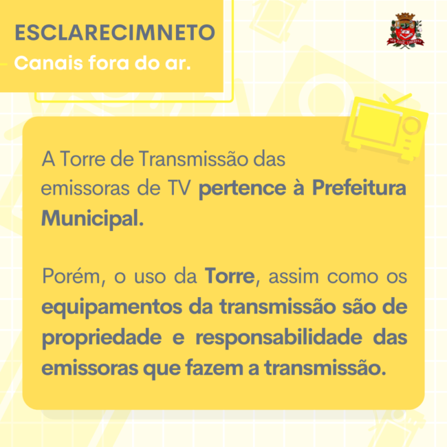 A Torre de Transmissão das emissoras de TV pertence à Prefeitura Municipal. Porém, o uso da Torre, assim como os equipamentos da transmissão são de propriedade e responsabilidade das emissoras que fazem a transmissão.Desse modo, se todas as emissoras estiverem fora do ar será um problema de responsabilidade da prefeitura que logo será sanado.No caso específico de uma emissora sair do ar e for detectado falha no equipamento digital da emissora eles são comunicados sobre o problema e são os responsáveis pela manutenção que demanda mão de obra especializada.Além disso, todas as emissoras usam sistemas de tele supervisão remota onde detectam a queda de sinal. A manutenção do equipamento e a geração de sinal para transmissão são de responsabilidade das emissoras