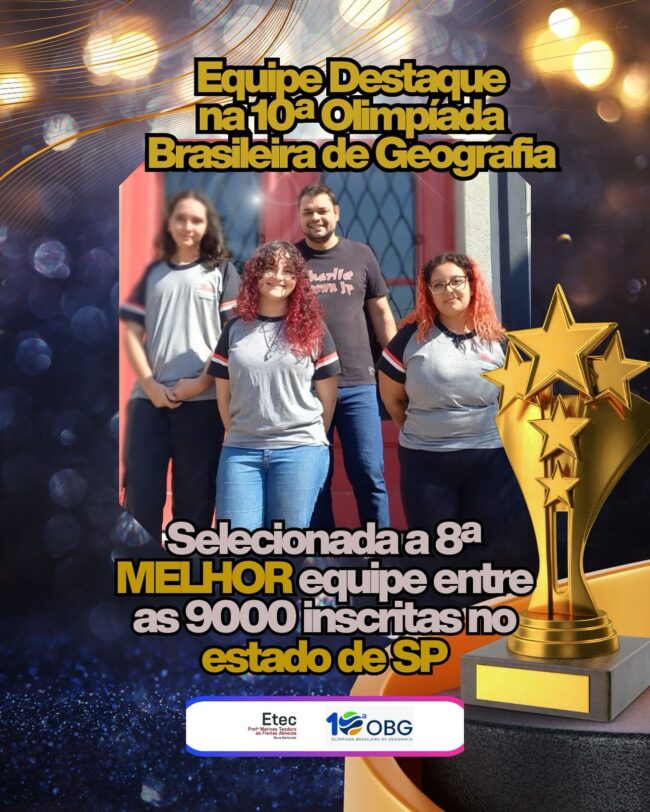 A ETEC Professora Marines Teodoro de Freitas Almeida, aqui de Novo Horizonte obteve resultados notável na 10ª edição da Olimpíada Brasileira de Geografia (OBG), consolidando-se como uma instituição educacional de ensino em destaque estadual.