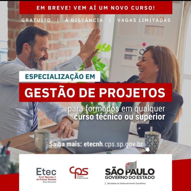 A partir do próximo semestre a Escola Técnica Estadual (ETEC) Professora Marinês Teodoro de Freitas Almeida passará a oferecer o curso de especialização técnica em Gestão de Projetos.O curso terá duração de 1 semestre e será totalmente à distância e gratuito. A especialização será voltada a quem já possui uma formação técnica ou superior em qualquer área do conhecimento. Informações sobre a abertura das inscrições para o processo seletivo (Vestibulinho) serão divulgadas futuramente.Para saber mais acesse: https://etecnh.cps.sp.gov.br/etec-nh-anuncia…/