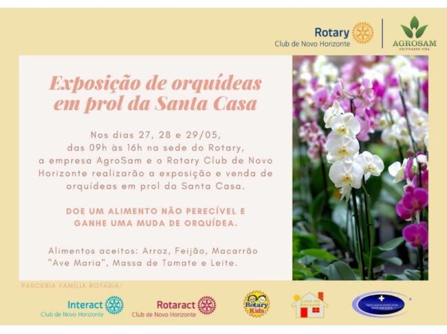 O Rotary Club de Novo Horizonte e a empresa AgroSam, irão realizar em prol a Santa Casa de Misericórdia de Novo Horizonte, uma Exposição e Venda de Orquídeas, que acontece na sede do Rotary das 09:00 ás 16:00h, nos dias 27,28 e 29/05.Doe um alimento não perecível citados abaixo e ganhe uma muda de Orquídea, venha fazer parte desta ação e se encantar com as lindas Orquídeas. Alimentos: Arroz, Feijão, Macarrão “Ave Maria”, Massa de Tomate e Leite. #ExposiçãoOrquídeas#NovoHorizonte#AgroSam#Rotary#SantaCasaNh#rededobem