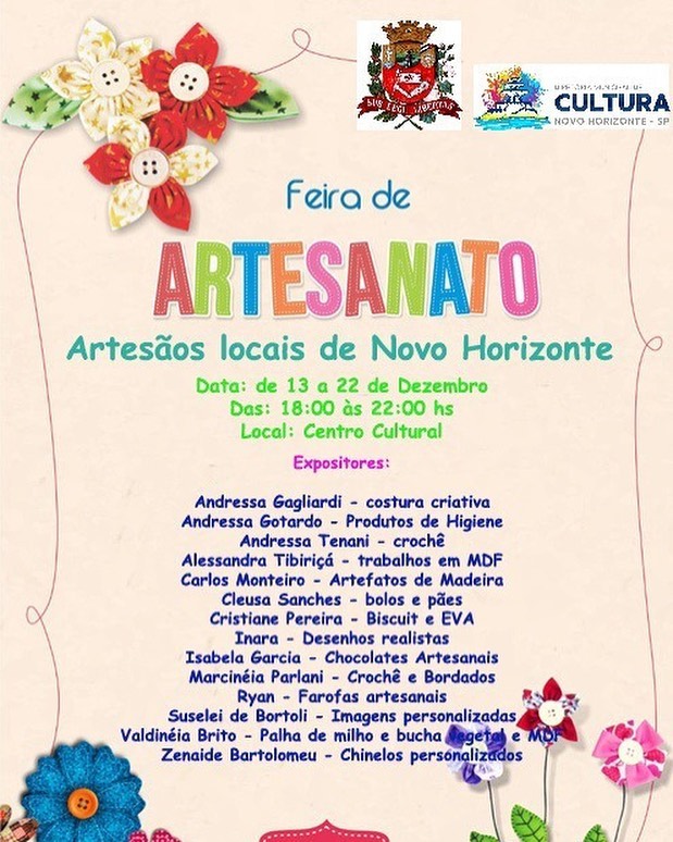 No intuito de promover os artesãos locais e abrilhantar nosso Natal, a Prefeitura de Novo Horizonte, através da Diretoria da Cultura, irá promover uma Feira de Artesanato para as festividades de Natal. São artesãos do nosso município que irão mostrar um pouquinho da sua arte. A Diretoria da Cultura está organizando e cadastrando nossos artesãos de maneira que, se você é um artesão e tem interesse em se juntar ao nosso time para o ano que vem, dirija-se ao Centro Cultural e faça sua inscrição. Novidades estão por vir!Cultura é vida! Cultura é saúde e bem-estar. Junte-se a nós.