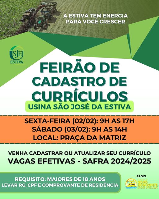 E assim sendo tem inicio amanhã e prossegue no sábado no horário das 9 as 14 horas o cadastramento e atualização de  Currículos da Usina São José da Estiva. A iniciativa que visa vagas efetivas para a safra 2024/2025 esta ocorrendo na Praça da Matriz e destinada a maiores de 18 anos. (Alvani)