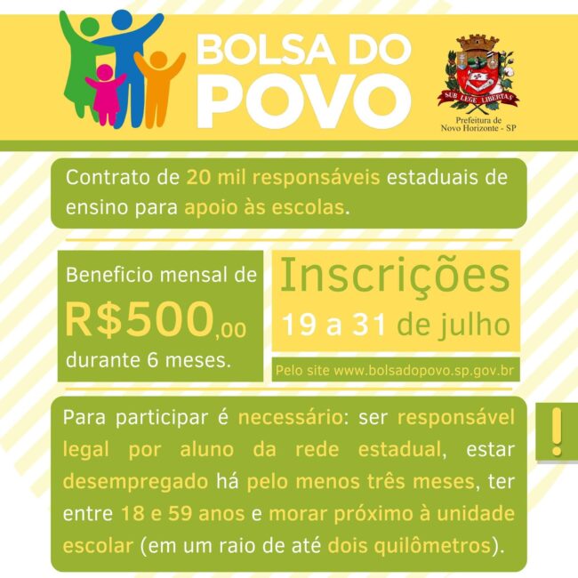 O Bolsa do Povo Educação tem como finalidade auxiliar as famílias a superar os desafios educacionais e financeiros provocados pela pandemia e ampliar o envolvimento de toda a comunidade escolar, reforçando vínculos entre alunos, professores e servidores da Educação e gerando novos postos de ocupação. Para participar é necessário: ser responsável legal por aluno da rede estadual (um responsável por família), estar desempregado há pelo menos três meses, ter entre 18 e 59 anos e morar próximo à unidade escolar (em um raio de até dois quilômetros). Após as inscrições, os candidatos serão entrevistados pelas próprias unidades de ensino. Após a aprovação das escolas, as Diretorias de Ensino vão fazer a validação para efetivar contratações a partir de 16 de agosto.