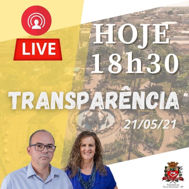 Hoje, a partir das 18h30, mais uma Live Transparência para que você, munícipe, saiba todas as ações da Gestão Municipal. Nossa Live é transmitida pelo Facebook, Instagram e YouTube da Prefeitura de Novo Horizonte.
