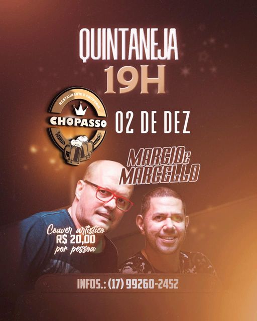 QUINTANEJA com Marcio e Marcello às 19h!Você vai perder? Já marca na agenda aí!O melhor de Novo Horizonte está aqui.Cover artístico R$20,00 por pessoa.Informações: (17) 99260-2452#chopasso#novohorizonte#bar#restaurante
