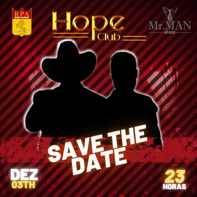 Dia 03 de Dezembro as 23h temos um encontro marcado no Hope Club.Quero ver quem vai adivinhar qual a dupla sertaneja que estamos trazendo pra vocês!!!Aguardo todos nesse Mega evento!