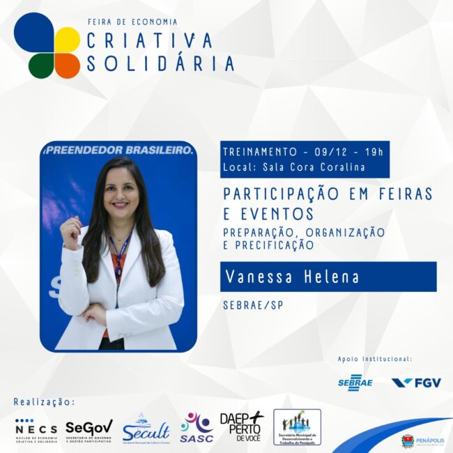 A ação é realizada em parceria com o Sebrae e a FGV, sendo organizado pelo NECS (Núcleo de Economia Criativa e Solidária), que é composto pela Secretaria de Cultura e Turismo, pela Secretaria de Assistência Social e Cidadania, pela Secretaria de Governo e Gestão Participativa, pela Secretaria de Desenvolvimento e Trabalho, pela Secretaria de Agricultura, Abastecimento e Meio Ambiente e pelo Daep (Departamento Autônomo de Água e Esgoto de Penápolis).