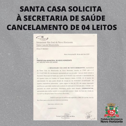 A Irmandade São José de Novo Horizonte, mantenedora da Santa Casa de Misericórdia encaminhou a Prefeitura Municipal ofício solicitando a Secretaria de Saúde que realize, a partir de hoje, 07/04/2021, o cancelamento de 04 leitos de Unidade de Terapia Intensiva Adulto Covid-19. De acordo com oficio assinado pela Vice Provedor, Teresa Cristina Abib da Silva, o pedido é necessário pois a Santa Casa teve uma queda abrupta de energia no dia 05/04/2021, inviabilizando 04 respiradores pulmonares, 04 réguas de leito da UTI e também pela falta de medicação no mercado para atendimento aos pacientes em estado gravíssimo. Diante do fato relatado a Irmandade solicita que a Secretaria de Saúde auxilie a Santa Casa e informe a Divisão Regional de Saúde – DRS XV de São José do Rio Preto para as devidas providências .Larissa Corrêa Diretoria de Comunicação PMNH