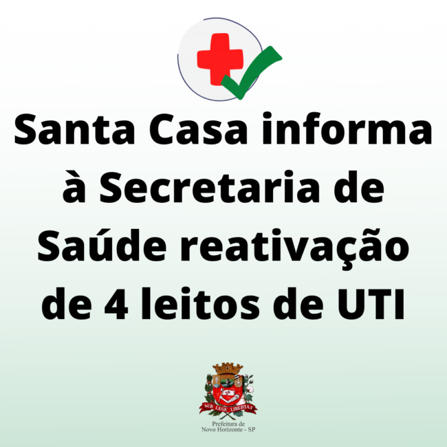 A Irmandade São José de Novo Horizonte, mantenedora da Santa Casa de Misericórdia encaminhou a Prefeitura Municipal ofício informando a Secretaria de Saúde que, a partir de hoje, 20/04/2021, está reativando os 04 leitos de Unidade de Terapia Intensiva Adulto Covid-19, que foram cancelados em 07 de abril. De acordo com oficio assinado pela Vice Provedor, Teresa Cristina Abib da Silva, os leitos passaram por manutenção e a partir de hoje a UTI da Santa Casa de Misericórida passa a funcionar em sua totalidade. A Irmandade solicita que a Secretaria Municipal de Saúde informe a Divisão Regional de Saúde – DRS XV de São José do Rio Preto do religamento dos 04 leitos .Larissa Corrêa Diretoria de Comunicação PMNH