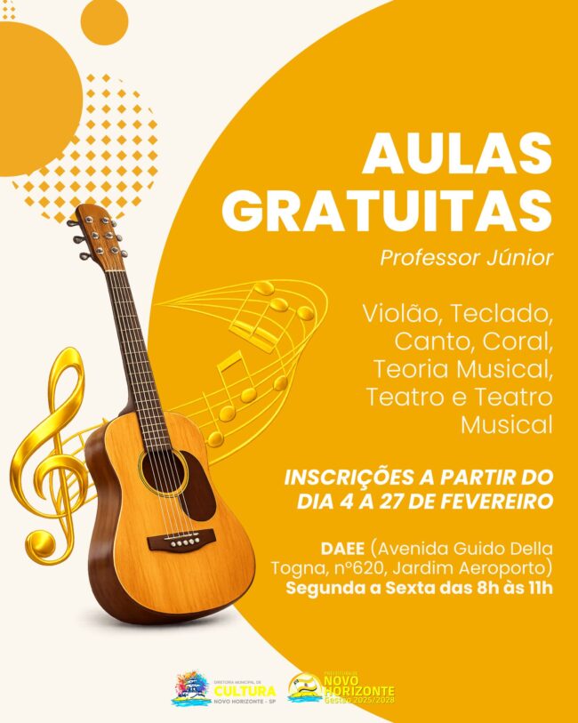 A Prefeitura de Novo Horizonte, por meio da Diretoria de Cultura, informa que estão abertas as inscrições para aulas de Violão, Teclado, Canto, Coral, Teoria Musical, Teatro e Teatro Musical , tudo gratuitamente para crianças a partir dos 12 anos. As inscrições se iniciaram no dia 4 e prossegue até o dia 27, na sede do DAEE – Avenida Guido Della Togna, nº 620, Jardim Aeroporto, no horário das 8h às 11h.
