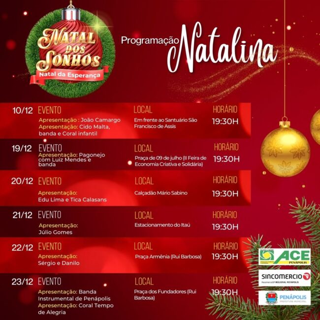 A iniciativa é uma parceria da Prefeitura de Penápolis com o Sincomercio e ACE (Associação Comercial e Empresarial), além do apoio da comunidade. O projeto “Natal dos Sonhos” está sob a coordenação das secretarias de Cultura e Turismo e de Desenvolvimento e Trabalho e conta com o apoio de todas as demais secretarias municipais e o Daep (Departamento Autônomo de Água e Esgoto de Penápolis).