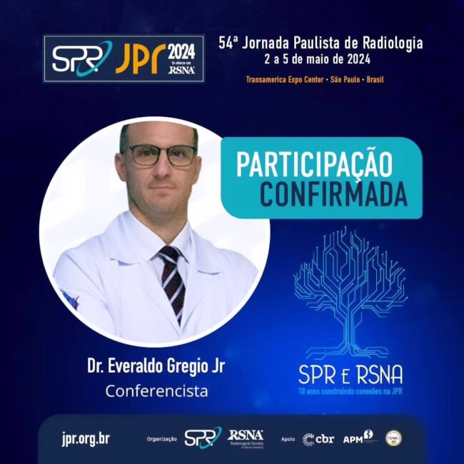 A participação do companheiro Everaldinho Gregio é mais do que especial, além de ter sido convidado para ser um dos palestrantes do evento, ele também completa 10 anos de Jornada Paulista de Radiologia, pois foi no ano de 2014 que ele apresentou a sua primeira aula com o tema “Avaliação dinâmica por US no entorse do tornozelo ” Parabéns Dr, orgulho de todos nós. Foto: Divulgação (Alvani)
