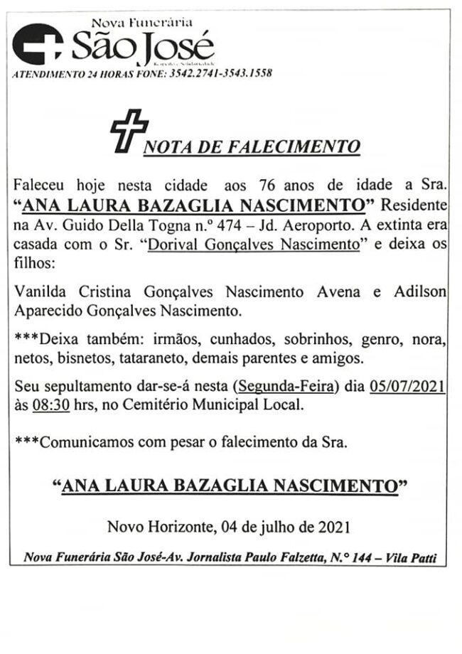 A nova Funerária São José e o Super Convênio São José comunica com pesar o falecimento da Sra. ANA LAURA BAZAGLIA NASCIMENTO. Que Deus conforte a familia e os amigos.