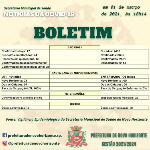 Boletim de hoje Segunda 01/03, onde 17 pessoas testaram positivo COVID-19, taxa de ocupação da U.T.I 100%, na cidade de Novo Horizonte-SP
