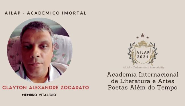 O professor e escritor de Novo Horizonte,Clayton Alexandre Zocarato acaba de conquistar mais uma grande honraria em sua vitoriosa carreira.Esta semana ele foi nomeado Acadêmico Imortal da Academia Internacional de Literatura e Artes (Membro Vitalício) ,que tem sua sede no estado de Alagoas.