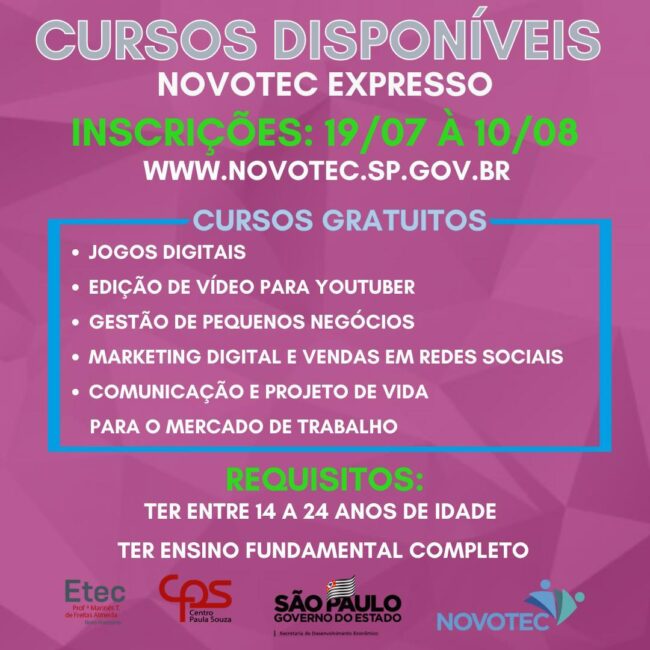 A Prefeitura de Novo Horizonte divulga os novos cursos gratuitos que a Etec do município, através do Novotec expresso, estará disponibilizando. Os cursos são indicados para alunos de 14 a 24 anos que tenham concluído o ensino fundamental.Serão cursos profissionalizantes com carga horária total de 120 horas, com aulas duas vezes na semana e no momento seguirá o formato semipresencial. As inscrições começam hoje e se prolongam até o dia 10 de agosto, devendo ser feitas através do site www.novotec.sp.gov.br.Texto: Julia Monteiro com supervisão de Larissa CorrêaDiretoria de Comunicação PMNH