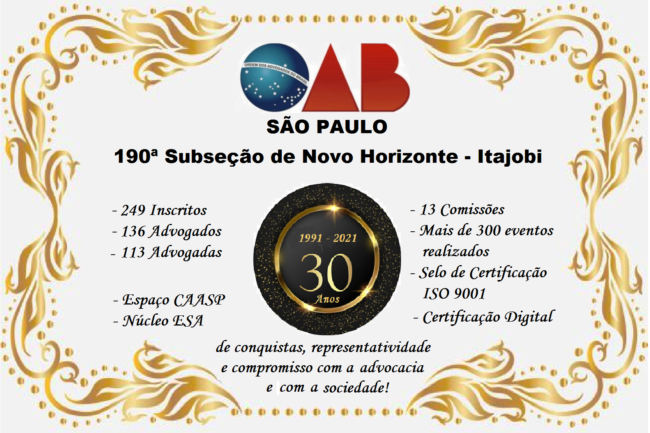 Assim sendo,com enorme alegria e satisfação que enaltecemos no dia de hoje o histórico aniversário de 30 anos da 190ª.Subseção da Ordem dos Advogados (OAB) de Novo Horizonte,que hoje tem como presidente a advogada Dra.Alvani Filomena Teixeira Magri.