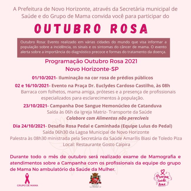 O movimento internacional de conscientização para a detecção precoce do câncer de mama, Outubro Rosa, foi criado no início da década de 1990, quando o símbolo da prevenção ao câncer de mama — o laço cor-de-rosa — foi lançado pela Fundação Susan G. Komen for the Cure e distribuído aos participantes da primeira Corrida pela Cura, realizada em Nova York (EUA) e, desde então, promovida anualmente. O período é celebrado no Brasil e no exterior com o objetivo de compartilhar informações e promover a conscientização sobre o câncer de mama, a fim de contribuir para a redução da incidência e da mortalidade pela doença. O objetivo do Outubro Rosa 2021 é divulgar informações sobre o câncer de mama e fortalecer as recomendações do Ministério da Saúde para prevenção, diagnóstico precoce e rastreamento da doença.O câncer de mama O câncer de mama é o tipo que mais acomete mulheres em todo o mundo, tanto em países em desenvolvimento quanto em países desenvolvidos. Cerca de 2,3 milhões de casos novos foram estimados para o ano de 2020 em todo o mundo, o que representa cerca de 24,5% de todos os tipos de neoplasias diagnosticadas nas mulheres. As taxas de incidência variam entre as diferentes regiões do planeta, com as maiores taxas nos países desenvolvidos. Para o Brasil, foram estimados 66.280 casos novos de câncer de mama em 2021, com um risco estimado de 61,61 casos a cada 100 mil mulheres. O câncer de mama também ocupa a primeira posição em mortalidade por câncer entre as mulheres no Brasil, com taxa de mortalidade ajustada por idade, pela população mundial, para 2019, de 14,23/100 mil. As maiores taxas de incidência e de mortalidade estão nas regiões Sul e Sudeste do Brasil. Os principais sinais e sintomas suspeitos de câncer de mama são: caroço (nódulo), geralmente endurecido, fixo e indolor; pele da mama avermelhada ou parecida com casca de laranja, alterações no bico do peito (mamilo) e saída espontânea de líquido de um dos mamilos. Também podem aparecer pequenos nódulos no pescoço ou na região embaixo dos braços (axilas).CurtirComentarCompartilhar