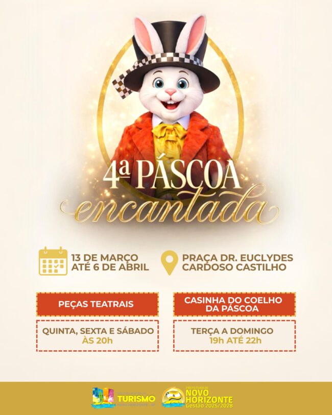 No último dia 13 de março, a Prefeitura de Novo Horizonte deu início à 4ª. Páscoa Encantada 2026, em um evento especial promovido pela Diretoria Municipal de Turismo e que já se tornou uma tradição em nosso município e que a cada ano recebe turistas e visitantes de toda a nossa região. A programação estará ocorrendo na Praça da Matriz, com uma extensa programação, incluindo peças teatrais e a Casinha do Coelhinho da Páscoa, que é aberta para visitação de quinta a domingo á partir as 20 horas.