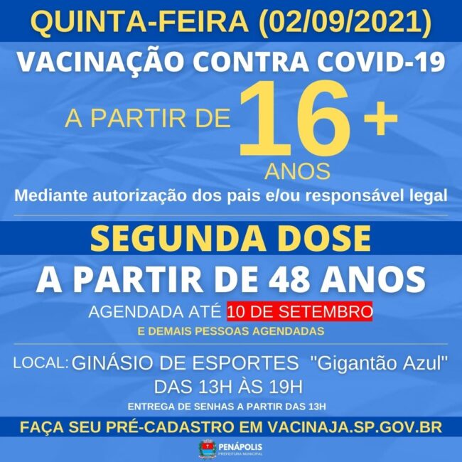 A Prefeitura de Penápolis informa que nesta quinta-feira, 02 de setembro, inicia uma nova etapa da vacinação contra a Covid-19 no município, contemplando os adolescentes com idade a partir de 16 anos. Vale ressaltar que os menores de idade devem estar acompanhados dos pais e/ou responsável legal; ou com autorização assinada por eles.