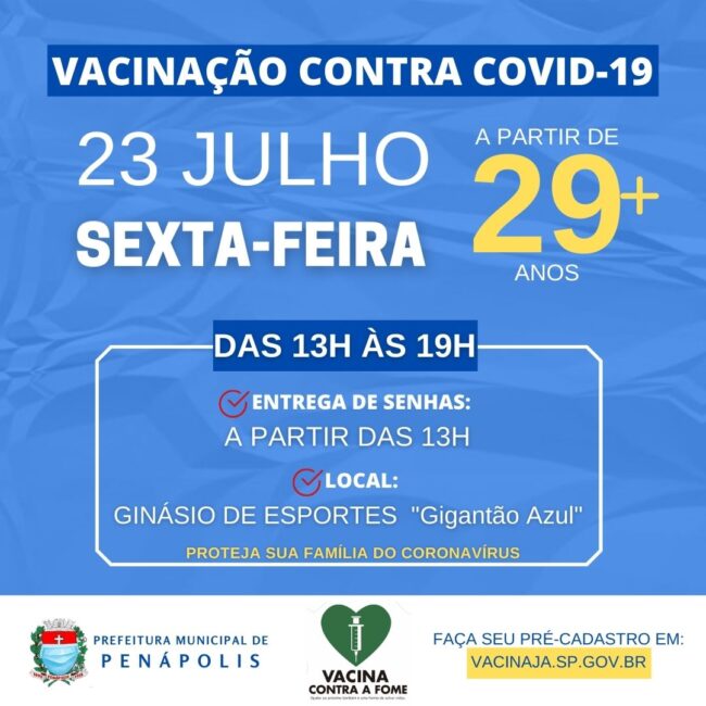 A Secretaria Municipal de Saúde informa que inicia nesta sexta-feira, 23, mais uma etapa da vacinação contra a Covid-19 em Penápolis. Dessa vez, serão contempladas as pessoas com idade a partir de 29 anos. A vacinação contra a Covid-19 é realizada apenas no Ginásio de Esportes “Prof. Antônio de Castilho Braga”, o Gigantão Azul. A distribuição de senhas se dá a partir das 13h e a vacinação ocorre das 13h às 19h. Sendo assim, qualquer pessoa que resida em Penápolis e tenha 29 anos ou mais, pode procurar o Ginásio de Esportes no horário indicado para garantir sua imunização contra a Covid-19. Importante Vale lembrar que é necessário levar documento de identificação com foto, cartão nacional do SUS e comprovante de residência. Para agilizar o atendimento, as pessoas incluídas neste grupo (29+) devem efetuar o pré-cadastro no site Vacina Já (www.vacinaja.sp.gov.br). Vacina contra a fome A campanha “Vacina contra a fome” para a doação voluntária de alimentos prossegue durante a vacinação contra a Covid-19. Quem quiser e puder colaborar, basta levar 1 kg de alimento não perecível durante a vacinação no Ginásio de Esportes. As doações serão destinadas ao Fundo Social de Solidariedade para a formação de cestas básicas, que serão entregues às famílias em situação de vulnerabilidade social. Secom – PMP