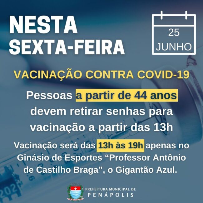 A Secretaria Municipal de Saúde informa que inicia nesta sexta-feira, 25, mais uma etapa da vacinação contra a Covid-19 em Penápolis. Dessa vez, serão contempladas as pessoas com idade a partir de 44 anos. A vacinação contra a Covid-19 acontece apenas no Ginásio de Esportes “Prof. Antônio de Castilho Braga”, o Gigantão Azul. A distribuição de senhas será a partir das 13h e a vacinação ocorrerá das 13h às 19h. No período da manhã, a prefeitura fará a higienização do Ginásio. Vale lembrar que é necessário levar documento de identificação com foto, cartão nacional do SUS e comprovante de residência. Para agilizar o atendimento, as pessoas incluídas neste grupo podem efetuar o pré-cadastro no site Vacina Já (www.vacinaja.com.br ). Na última quarta-feira, 23, teve início a vacinação de pessoas de 45 a 49 anos. E nesta sexta-feira, 25, inicia o público a partir de 44 anos. A inclusão de nova faixa etária será divulgada nos próximos dias, conforme envio de novas doses para o município. Vacina contra a fome A campanha “Vacina contra a fome” para a doação voluntária de alimentos prossegue durante a vacinação contra a Covid-19. Quem quiser e puder colaborar, basta levar 1 kg de alimento não perecível durante a vacinação no Ginásio de Esportes. Serão arrecadados donativos que compõem a cesta básica, como por exemplo: arroz, feijão, macarrão, óleo, molho, farinha, fubá, leite, entre outros itens alimentícios e também de higiene e limpeza. As doações serão destinadas ao Fundo Social de Solidariedade para a formação de cestas básicas, que serão entregues às famílias em situação de vulnerabilidade social. Secom – PMP