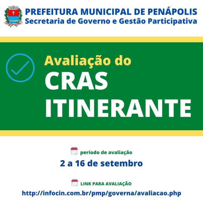 O primeiro serviço que está sendo colocado para avaliação é o projeto Cras Itinerante, desenvolvido pela Secretaria Municipal de Assistência Social e Cidadania. Todo cidadão que desejar pode acessar o link http://infocin.com.br/pmp/governa/avaliacao.php e clicar no formulário que está disponível até o próximo dia 16 de setembro.