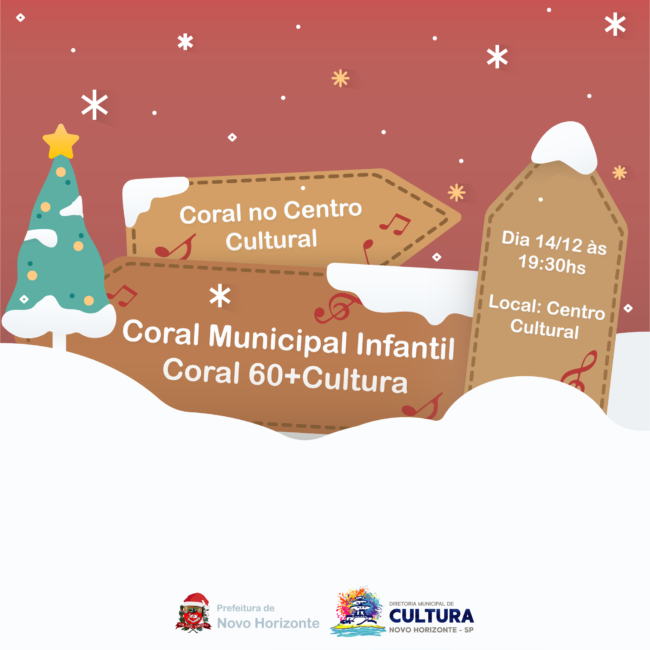 A Prefeitura de Novo Horizonte, através da Diretoria da Cultura, realizará evento hoje, dia 14, às 19:30hs, que abrirá a Programação Cultural do Natal de Bênção e Luz. Trata-se da primeira apresentação do Coral Municipal Infantil de Novo Horizonte. O coral foi criado durante o evento “A voz infantil novo-horizontina”.Durante os ensaios, a Diretoria da Cultura mapeou as vozes talentosas com o intuito de apoiar e incentivar nossas crianças através da formação desse coral. Após a apresentação no Centro Cultural, as crianças sairão cantando no trenzinho para alegrar nossa cidade.Após a apresentação do Coral Infantil, haverá a apresentação do Coral de Idosos 60+Cultura.