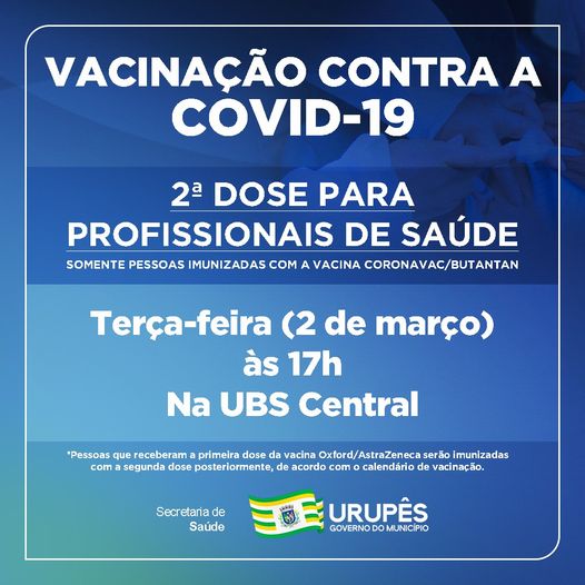 Compareça à UBS Dr. Xisto Albarelli Rangel, no Centro de Urupês, portando o cartão da Campanha de Vacinação que você recebeu ao tomar a primeira dose do imunizante.Pessoas que receberam a primeira dose da vacina Oxford/AstraZeneca receberão a segunda dose posteriormente, de acordo com o calendário de vacinação.Juntos, vamos vencer esta doença. #vacinaUrupês