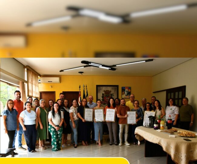 A solenidade aconteceu no Gabinete do Prefeito e contou com a presença do chefe do Executivo Municipal, Fabiano Belentani, que, ao lado do Secretário Municipal de Educação, Ademir Almagro, conduziu a entrega das Placas de Escola Ouro 2024.Receberam a homenagem os gestores da EMEF Professora Nilva Dalbello de Lima (nota 7,06), da EMEF Professor Moacyr de Freitas (nota 7,78), da EMEF Professor José Luís Tomazi (nota 7,80) e do CME Professora Salete Aparecida Laude (nota 7,45).