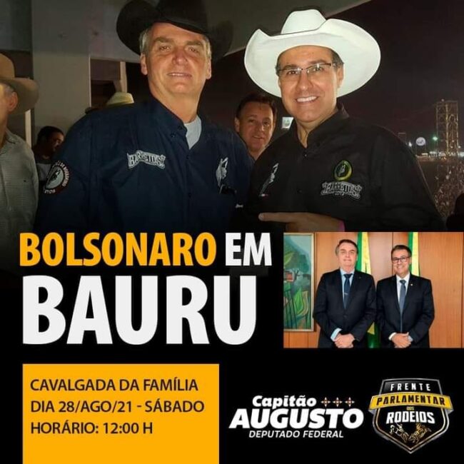 O evento que foi identificado pela assessoria como ‘Cavalgada do Agro’, será realizada no dia 28 de Agosto, às 12h, com previsão para sair próximo ao aeroclube de Bauru.A iniciativa é do deputado federal Capitão Augusto,que nos últimos anos tem feito um trabalho muito grande em apoio dos eventos agropecuários,através da Frente Parlamentar de Rodeios.