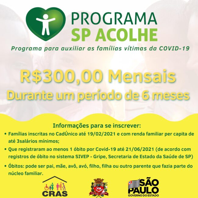 O Governo do Estado de São Paulo lançou nesta semana o programa SP Acolhe voltado para pessoas que perderam algum familiar em consequência da covid-19. O auxílio será pago em 06 parcelas mensais de R$ 300,00 de julho a dezembro de 2021. Serão beneficiadas famílias: Inscritas no CadÚnico até o dia 19/02/2021 Com renda mensal de até 3 salários mínimos, Que tiveram perda de pelo menos um membro pela covid-19, podendo ser filhos, cônjuges, pais, etc., desde que o(s) óbito(s) tenha(m) ocorrido dentro do núcleo familiar. O óbito do familiar tenha ocorrido até o dia 21/06/2021. A consulta de elegibilidade pode ser feita no CRAS, localizado à Rua 28 de Outubro, 373 e, também, por meio do Portal Bolsa do Povo (www.bolsadopovo.sp.gov.br).