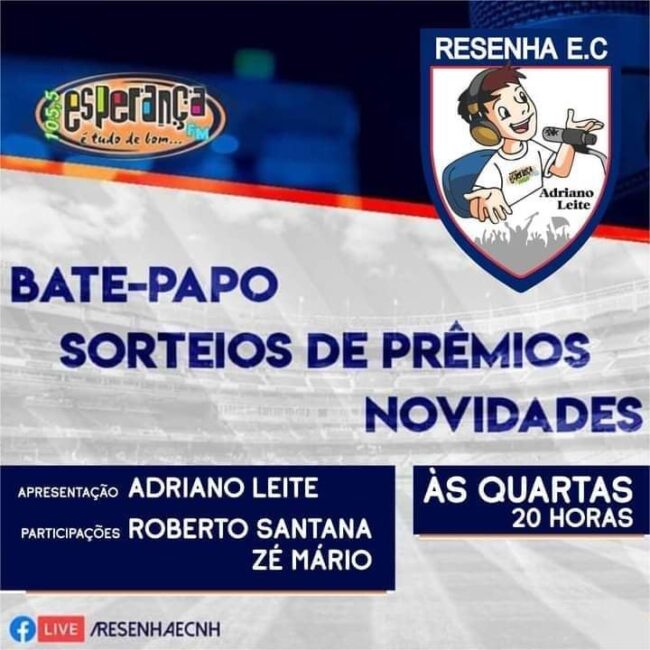 CLÉO SILVA PARTICIPARÁ DO PROGRAMA RESENHA ESPORTE CLUBE DE HOJE, PELA RÁDIO E TV ESPERANÇA FM, VIA CELULAR; GOIANO TAMBÉM, MAS POR ÁUDIOO Resenha Esporte Clube, programa esportivo semanal da Rádio e TV Esperança de Novo Horizonte, terá hoje as participações especiais de Cléo Silva e de Luís Carlos Goiano, respectivamente atacante e executivo de futebol do Grêmio Novorizontino.A presença de Cléo Silva será via celular, e já no começo do programa, mas Goiano mandará áudio respondendo algumas perguntas previamente elaboradas pelo jornalista Roberto Santana, administrador e editor desta página – O NOVORIZONTINO, também integrante do grupo de comentaristas do programa comandado pelo radialista Adriano Leite, formado ainda pelos craques Zé Mário e Peterson Machado.Os ouvintes e telespectadores poderão participar, mandando perguntas para o entrevistado Cléo Silva e para os integrantes do programa que começa às 20 horas. Compartilhe a live do programa e concorra aos sorteios de vários brindes. Quanto mais compartilhar, mais chances para ganhar.Nas fotos/Divulgação Novorizontino: Cléo Silva e Goiano
