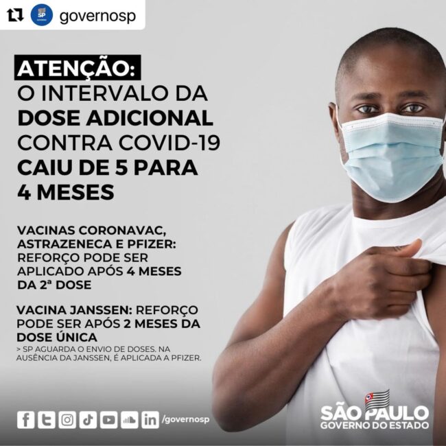 Atenção: SP REDUZIU o intervalo da dose de reforço de cinco para 4 MESES! A medida vale para toda população adulta (+18) que completou o esquema vacinal com os imunizantes Coronavac, Astrazeneca e Pfizer.A redução segue recomendação do Comitê Científico do Coronavírus do Estado de São Paulo, em atenção ao atual cenário epidemiológico da doença no mundo e a proximidade das festividades de final de ano. Além disso, foi considerado que o estado é porta de entrada, via portos e aeroportos, de pessoas de todo o mundo e o Brasil não exige apresentação de comprovante de esquema vacinal completo para os viajantes.