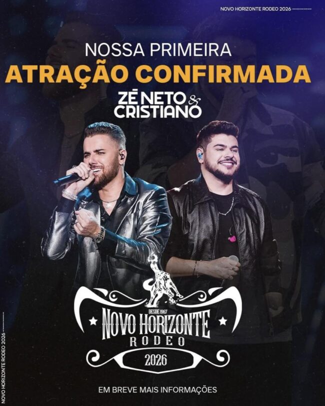 E lembrando ainda que no próximo ano, o feriado de 12 de outubro, data do dia das crianças e de Nossa Senhora Aparecida estará ocorrendo numa segunda feira, o que fará com que as festa termine no domingo, dia 11. Inclusive a primeira atração musical para 2026, também já foi confirmada, trata-se de uma das melhores e mais consagradas duplas sertanejas de nosso pais, Zé Neto & Cristiano que se apresentarão por aqui no dia 8 de outubro. Arte: D. Comunicação/PMNH (Alvani)