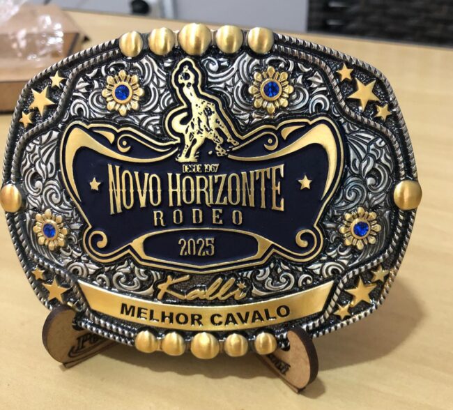 Além das tradicionais fivelas da Ekip Rozeta, os CAMPEÕES em cutiano e touros da 56a. Festa do Peão de Novo Horizonte também estarão recebendo fivelas personalizadas da Kalli Produções.