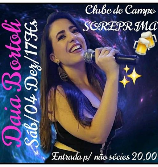 ando continuidade a sua programação especial de final de ano,neste sábado,a partir das 17 horas teremos aqui no Clube de Campo mais uma grande atração musical.Teremos um grande show com a cantora sensação de nossa cidade e região a vocalista DAIA BORTOLI.DAIA apresenta um repertorio super animado trazendo sempre o melhor da musica sertaneja universitária e também todos os hits do momento.Os associados terão entrada franca e será permitida a entrada de não sócio,desde que apresentado por um associado e com a compra do convite de R$20,00.Tenha um bom inicio de semana na melhor companhia na SOREPRIMA
