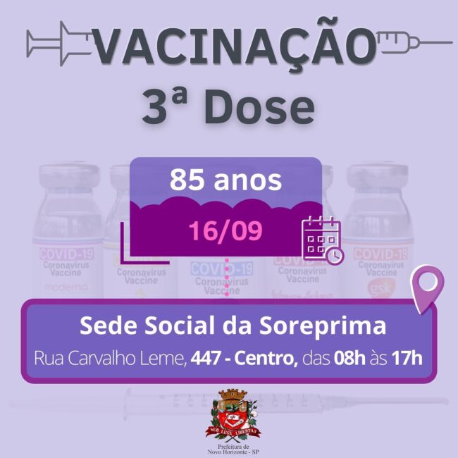 A Secretaria de Saúde de Novo Horizonte iniciará a aplicação da 3ª dose da vacina, contra a Covid-19, a partir desta quinta-feira (16), em idosos com 85 anos, que receberam a 2ª dose a pelo menos 6 meses. Idosos com 85 anos que estão acamados devem solicitar o agendamento através do telefone 17 99683 7555 e somente para o idoso que possuir dificuldade de locomoção ou não tenha condições de descer do carro, a 3ª dose da vacina será aplicada na UBS Alvorada, das 13h às 17h. Vale ressaltar que é necessário apresentar RG e CPF, além do Cartão para comprovar as duas primeiras doses, na Sede Social da Soreprima, das 8h às 17h.