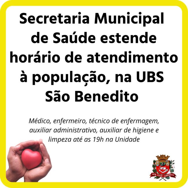 A Prefeitura de Novo Horizonte, através da Secretaria Municipal de Saúde em parceria com a Associação Mahatma Gandhi, comunica que a partir de 01/09/2021, a UBS São Benedito terá o horário estendido até as 19 horas. A Unidade terá uma equipe de plantão, das 17h às 19h, composta por médico, enfermeiro, técnico de enfermagem, auxiliar administrativo, auxiliar de higiene e limpeza para atender as demandas do município.