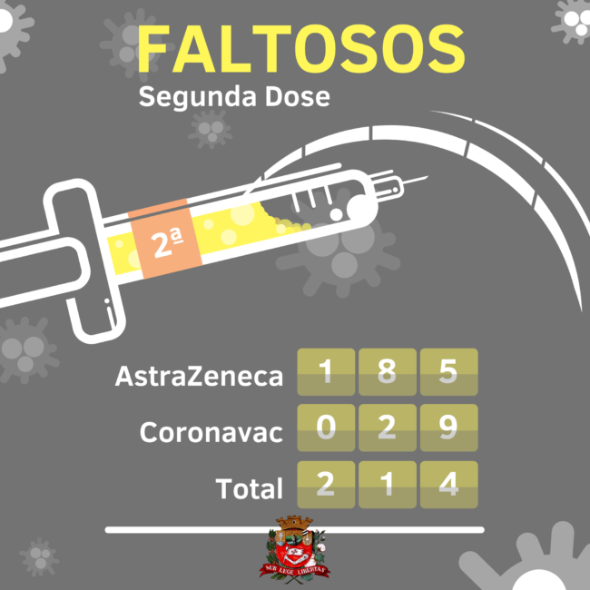 A Secretaria de Saúde de Novo Horizonte, através da Vigilância Epidemiológica está realizando uma busca ativa por 214 faltosos da segunda dose da vacina contra a covid-19. A intenção é realizar a busca por 29 pessoas que precisam tomar a segunda dose de Coronavac e 185 pessoas que precisam completar a imunização com a AstraZeneca. Quem perdeu o dia de receber a segunda dose pode se vacinar a qualquer momento: basta procurar o posto de imunização que esteja aplicando a fabricante correspondente à vacina inicial. É extremamente importante completar o calendário vacinal para conseguir bloquear a circulação da variante delta do coronavírus, que já está no estado de São Paulo.