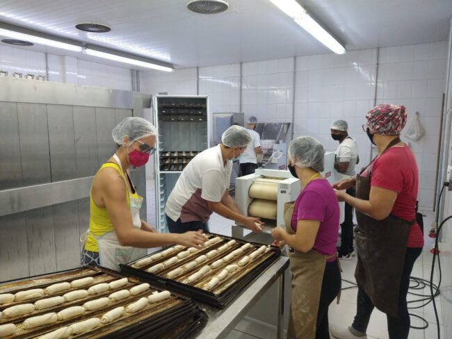 Para abastecer as mais de 30 escolas, 34 mil pães foram produzidos pelas equipes. É da Cozinha Piloto que todos os alimentos saem separados, pesados e prontos para a montagem em cada unidade.