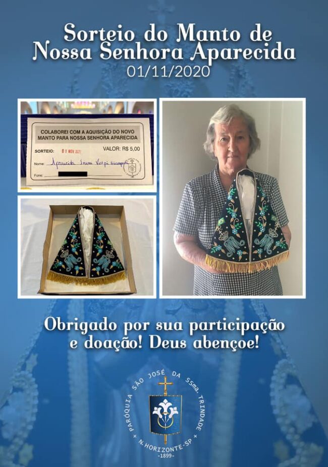 No último dia 1 de novembro durante a Santa Missa na Paróquia de São José da Santíssima Trindade,o Padre Fábio fez o esperado sorteio do manto da imagem de Nossa Senhora Aparecida. E a grande sorteada foi a senhora Aparecida Giampani.